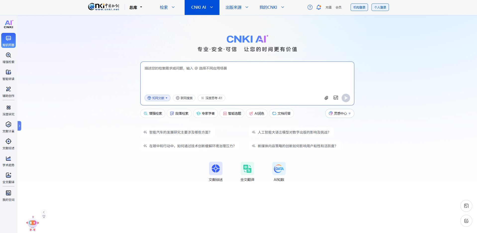 CNKI AI,是中国知网全面拥抱AI,赋能知识服务的全新探索,是推进问答式增强检索和生成式知识服务的场景实践。平台基于AI技术驱动的专业知识+深度思考、可信增强+可控生成的智能化服务,全面融合AI学术研究助手和AI增强检索,理解更加精准全面,解答更有专业深度,构建人工智能时代学术研究、科技创新、科学决策、全民阅读和人才培养的新范式。