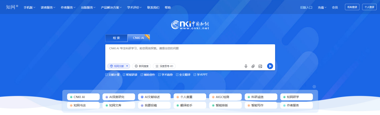 登录知网首页www.cnki.net,切换至CNKI AI进入;你也可以直接输入https://ai.cnki.net/进入。