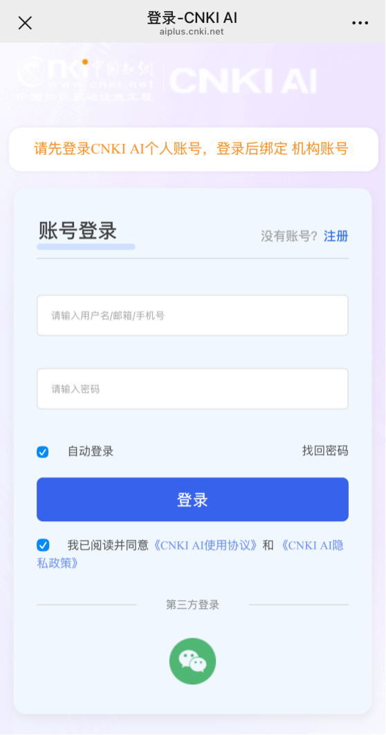 操作步骤:微信扫描二维码,登录知网个人账号,绑定CNKI AI机构主账号方可获得使用权益。