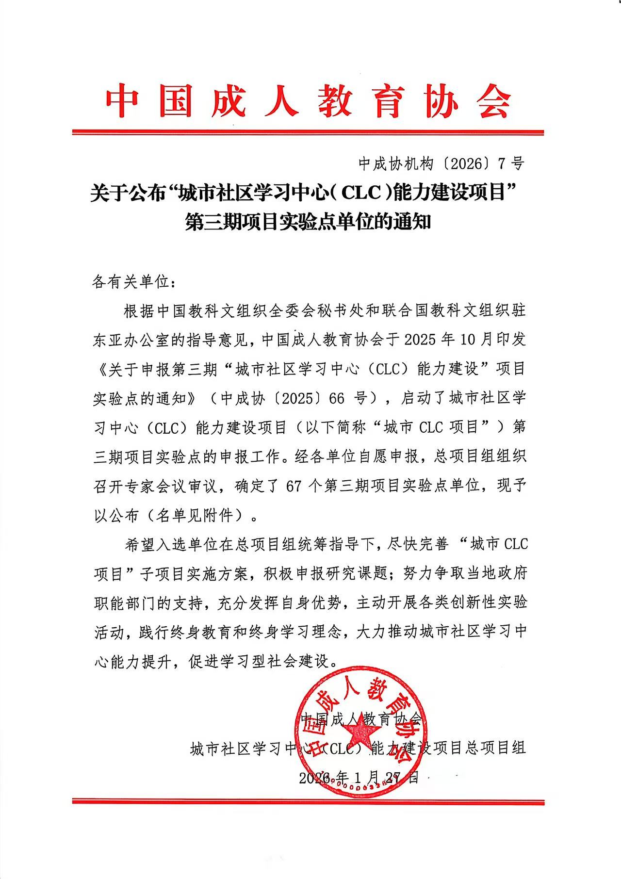 1月27日,中国成人教育协会正式发布《关于公布“城市社区学习中心(CLC)能力建设项目”第三期项目实验点单位的通知》,长春开放大学(长春社区大学)凭借在社区教育领域的卓越表现与深厚积累,成功跻身全国67个实验点行列。这一殊荣不仅是对学校过往努力的高度认可,更标志着长春开放大学在服务全民终身学习、推动学习型社会建设的征程中迈出了坚实且关键的一步。