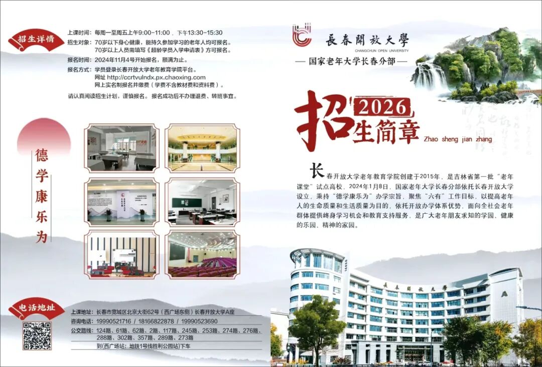 长春开放大学老年教育学院创建于2015年,是吉林省第一批“老年课堂”试点高校。为了进一步贯彻落实党的二十大精神,实施积极应对人口老龄化国家战略,中央组织部、教育部、国家卫健委(全国老龄办)、民政部、发改委、文化和旅游部、退役军人事务部、中国科学技术协会等8个部门联合筹建国家老年大学。2023年3月3日,国家老年大学正式挂牌成立。2024年1月8日,国家老年大学长春分部依托长春开放大学设立,秉持“德学康乐为”办学宗旨,聚焦“六有”工作目标,以提高老年人的生命质量和生活质量为目的,依托开放办学体系优势,面向全社会老年群体提供终身学习机会和教育支持服务,是广大老年朋友求知的学园、健康的乐园、精神的家园。