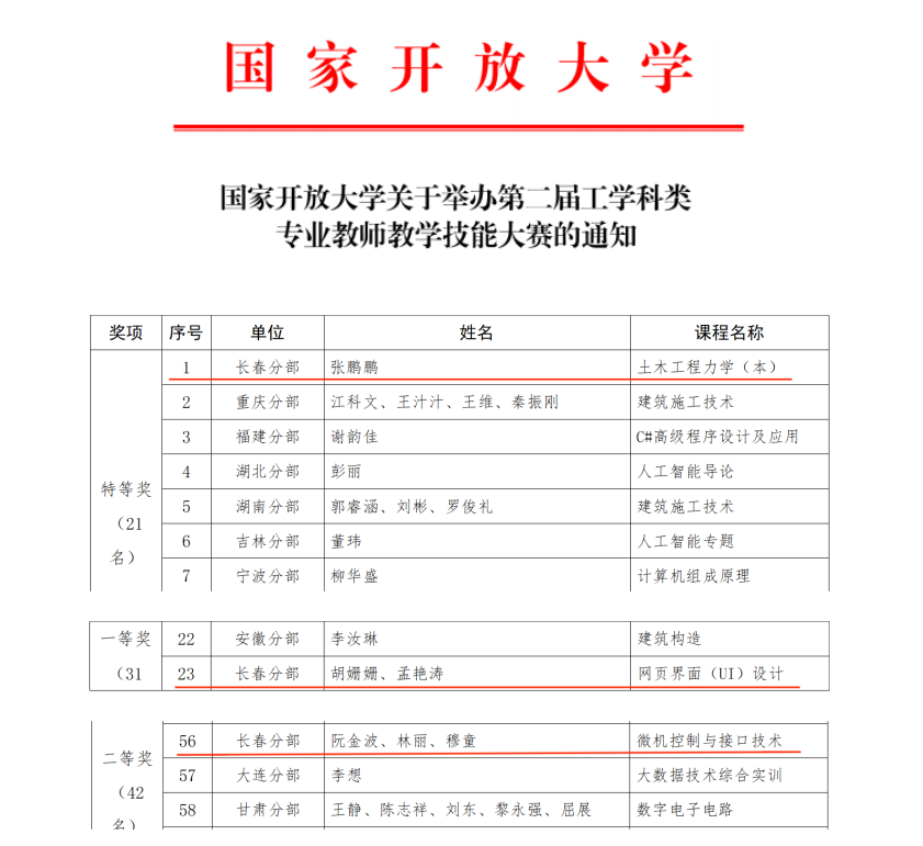 喜讯传来,硕果盈枝!在国家开放大学举办的“第二届工学科类专业教师教学技能大赛”中,我校理工医药系教师表现卓越,6名教师的三个参赛作品分别斩获特等奖、一等奖、二等奖!
