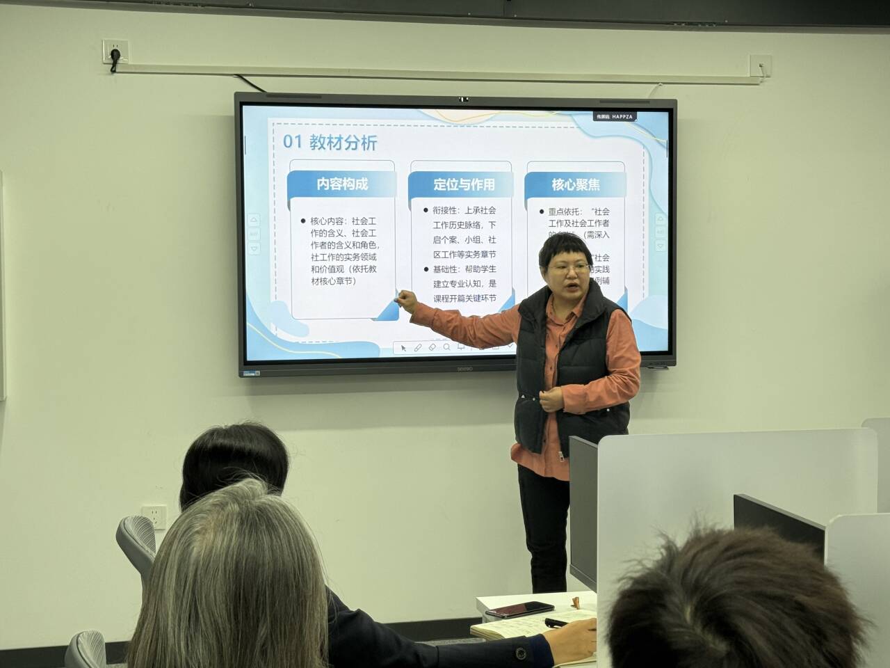 研讨会上,刘蕾老师就其《社会学概论》中的重点章节“社会工作的内涵、领域与价值观”进行了系统性的说课展示。她以清晰的逻辑脉络,依次阐述了本章节的教学目标、学情分析、重难点把握、教学过程设计与教学反思。在核心讲解环节,刘老师通过定义拆解、丰富实例与时域辨析表格,生动阐释了社会工作的专业特性;在案例讨论部分,她引入发人深省的“小龙案例”,引导学生剖析社工老李因方法僵化对服务对象造成的潜在伤害,从而深刻理解“以人为本、助人自助”的专业价值观,整个教学设计体现了理论深度与人文关怀的有机结合。