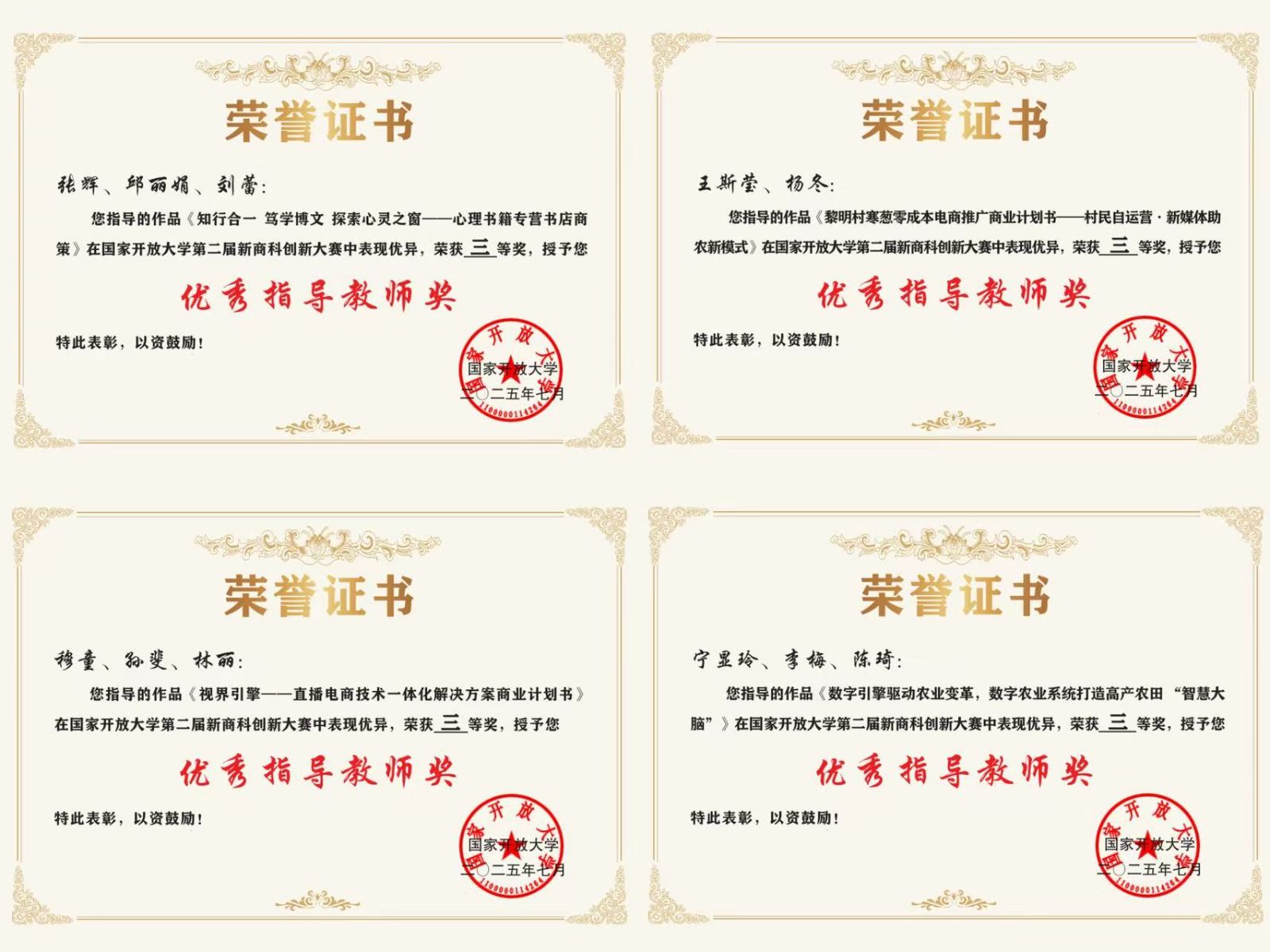 此次赛事获奖,既是国家开放大学对我校新商科教育成果的高度认可,也是我校深化教育教学改革、推进创新人才培养的生动实践。未来,我校将以此次赛事为新起点,持续优化育人模式,强化专业建设与实践教学融合,充分发挥创新教育与专业教育的协同育人效能,不断增强学生创新素养和岗位胜任力,为培养更多技能型应用型人才贡献力量!