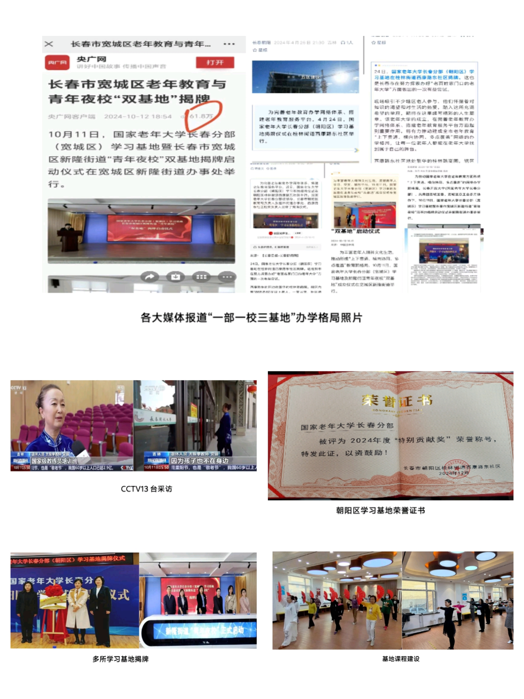 2024年3月,学院创新构建 “一部一校三基地” 办学新格局,成功打造长春市首个 “15分钟老年教育学习圈”。各学习基地的揭牌与办学活动获吉林日报、中国吉林网、掌上长春、宽城区人民政府官网等主流媒体与官方平台密集报道超过20次。其中,央广网对宽城区“双基地”的报道,单篇阅读量高达61.8万,引发了强烈的社会反响。在此基础上,充分发挥长春开放大学办学体系优势,逐步建立起覆盖市、县(区)、乡、村(社区)的全方位老年教育网络,推动服务精准下沉,做到了送课到老年人家门口,真正将“有温度的老年大学”办到了老百姓的家门口。