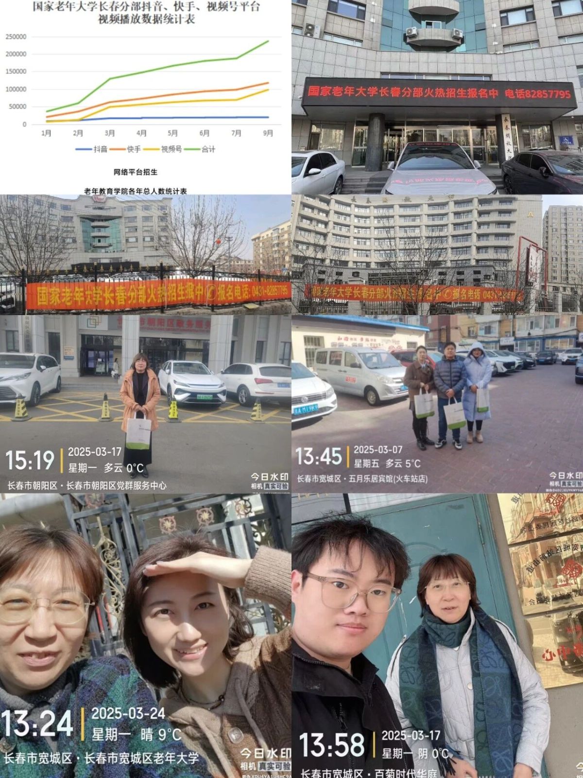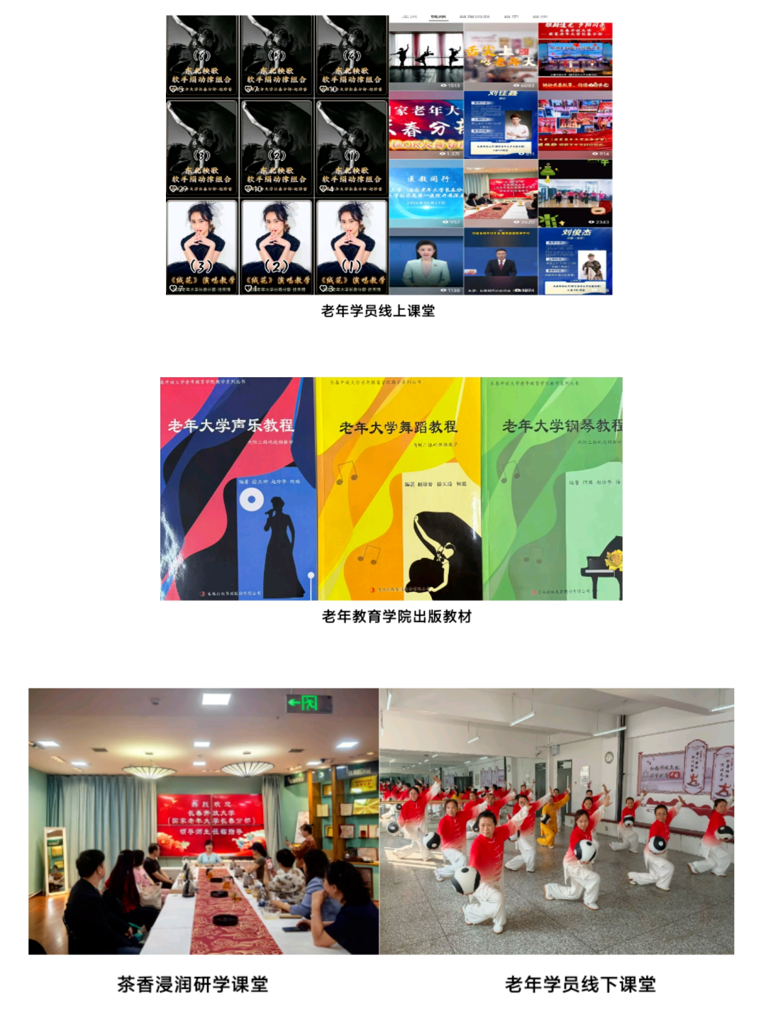 实践 “云上课堂、研学课堂、线下课堂” 三课结合的新模式。“云上课堂” 依托国家老年大学平台和老年教育学院抖音、快手、微信视频号三大平台,发布教学片段、课程推荐、活动类视频,完成直播15场,三平台总视频共计177个,视频多平台总播放量达到23万,运营10个月三平台总粉丝量增加1226人。链接长春广播电视台媒体资源,开学季在长春新闻、长春广播电视台等主流媒体推送播放,大大提高学校招生宣传力度和社会影响力。“线下课堂”推行“年度班+候鸟班”分级授课模式,出版钢琴、舞蹈、声乐、智能手机应用等贴合老年人认知特点的校本教材,开发覆盖“大师美妆”“茶城品茗”“东北秧歌”“非遗面点”等具有长春特色的研学课程,确保学员从“有兴趣”到“有精进”,让品牌课程有质有效,让学员在行走中学习,在实践中感受文化魅力。