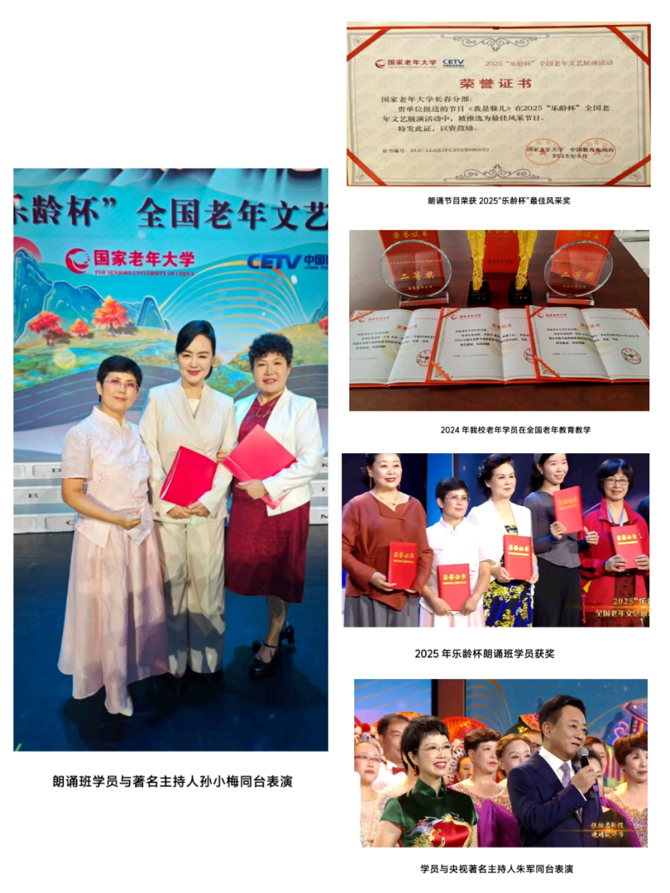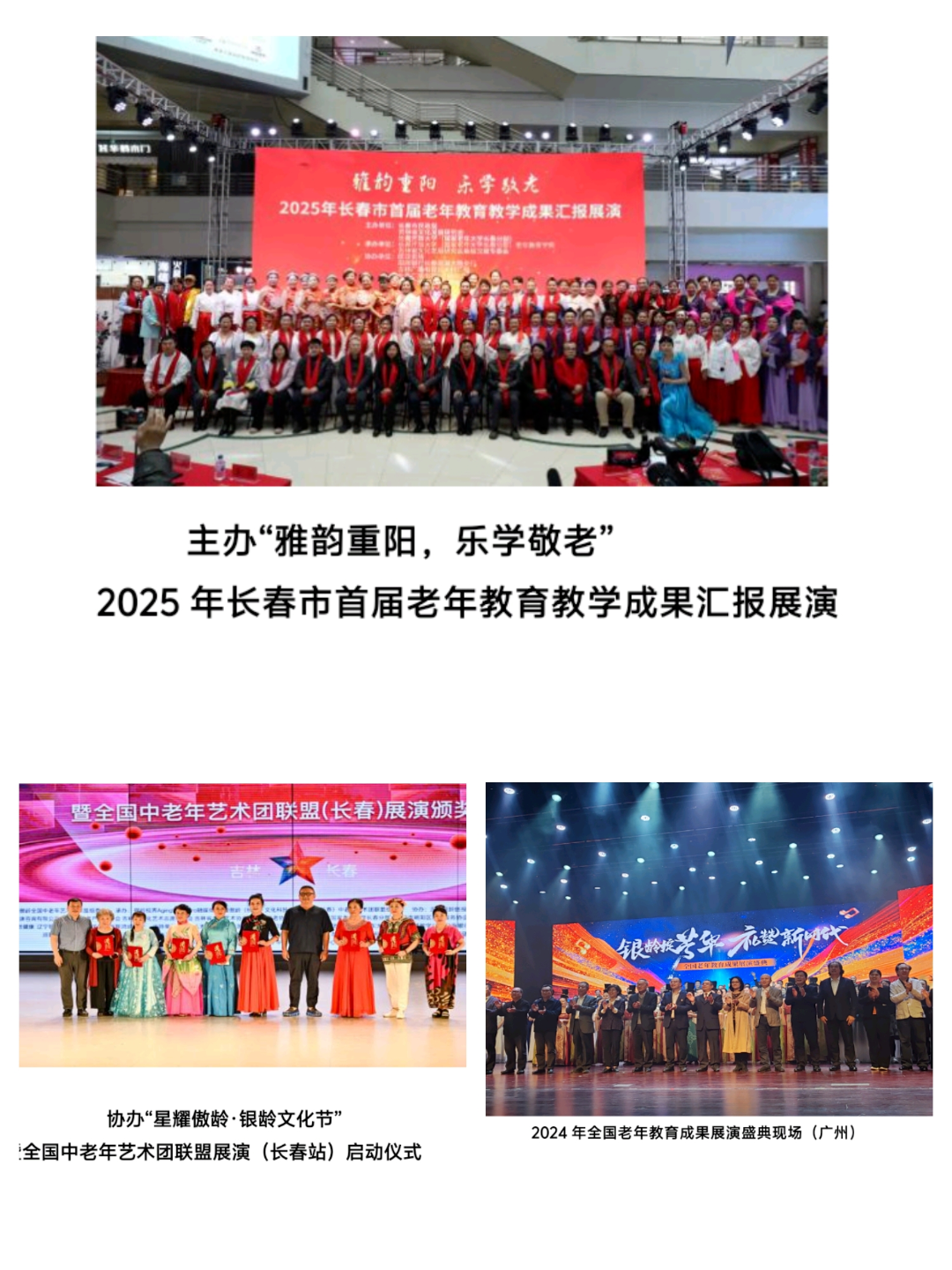 我们为学员搭建从班级、学校、省市到国家的四级展示舞台,让每一次活动展示都成为老年教育品牌的生动代言。2024年,老年教育学院成功承办 “国家老年大学2024年全国老年教育器乐类教学成果展”,历时6个月,征集全国42个分部(单位)选送的441个作品,经资格审查、初审、复审、终审等环节,最终评选出96个获奖作品,承办工作获得国家老年大学高度评价,老年教育学院学员一举斩获全国老年教育教学成果奖16项(一等奖3项、二等奖4项、三等奖7项、优秀奖2项)。学院教师团队孙丹、徐天琦、刘航佳、赵珍誉、王吉双等教师共计 14人次荣获“国家老年大学2024年全国教学成果展优秀指导教师”称号,覆盖器乐、合唱、舞蹈等多个类别,展现了卓越的教学实力。银龄教师、声乐学员安丽接受央视CCTV-13采访,在九九重阳节当天播出;朗诵班学员登上全国展演舞台并获CCTV-13报道;2025年,统筹组织长春市3所超过万人的老年大学参加国家老年大学主办的“乐龄杯”全国老年文艺展演活动,60个作品中共有25个作品进入复赛,朗诵班学员幕慧敏、王秋云的作品《我是躲儿》成功入围总展演,荣膺全国“乐龄杯最佳风采节目”殊荣,并与著名央视主持人朱军、孙小梅同台演出于中国教育电视台、中央电视台CCTV-13的闭幕式晚会,长春开放大学老年教育的社会影响力持续攀升。