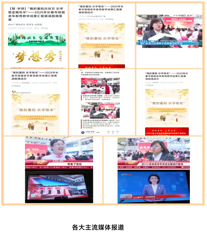 在活动载体上联动,让“六有”可触可感。我们以“赛、节、会”为载体,将“六有”品牌具体化。2025年7月,协办“星耀傲龄·银龄文化节暨全国中老年艺术团联盟展演(长春站)启动仪式”;2025年10月29日重阳节,由我校牵头、联合长春市民政局与吉林省文化发展研究会共同主办的“雅韵重阳,乐学敬老”2025年长春市首届老年教育教学成果汇报展演在欧亚卖场成功举办 ,全市11个城区的30支老年队伍、近500名学员参与其中。该活动获得吉林广播电视台、守望都市、长春新闻、长春广播电视台FM88.0、长春广播电视台90.0、长春广播电视台99.6 等 7家省市主流媒体的深度聚焦与连续报道,形成立体传播声势,充分展示了长春开放大学老年教育的丰硕成果和老年教育领域整合社会资源的能力。