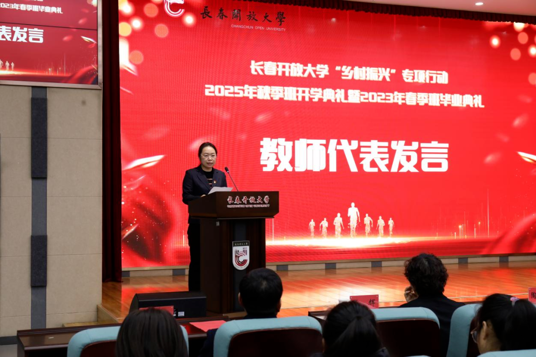 长春开放大学直属学院院长王春妍副教授作为教师代表,深情回顾了陪伴学员成长的温暖历程。她鼓励新老学员以“空杯心态”补短板,不断汲取新知识;以“攻坚姿态”破难题,勇敢面对挑战;以“赤子之心”担使命,在乡村振兴的伟大实践中书写精彩人生。