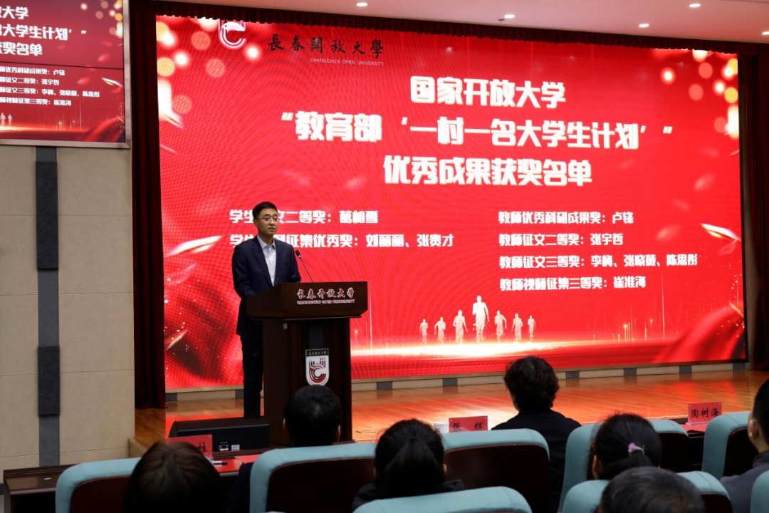 党委副书记杨勇宣读了《长春开放大学“乡村振兴”专项行动师生获奖情况通报》。通报内容振奋人心,既彰显了师生投身乡村振兴的责任担当,也为全校上下树立了学习标杆,激励着全体师生以获奖代表为榜样,在开放教育服务乡村振兴的征程中凝聚共识、汇聚力量,为推动吉林乡村全面振兴、全方位振兴贡献长春开放大学的智慧与力量。