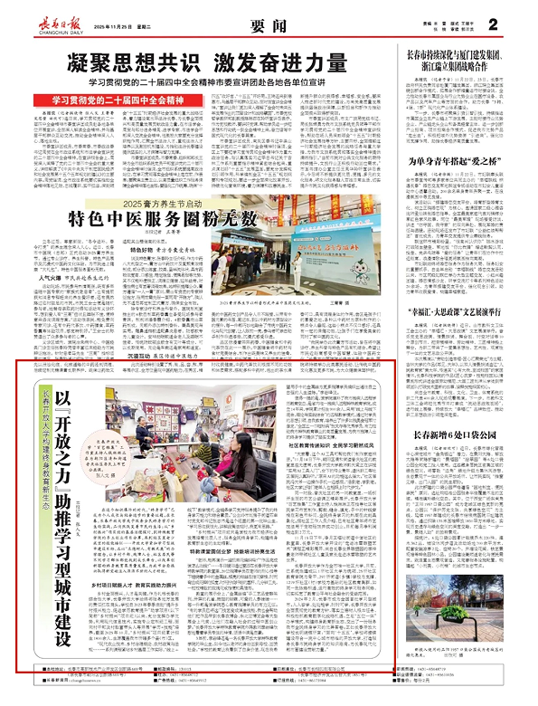 2025年11月25日,《长春日报》以《构建终身教育新生态——以“开放之力”助推学习型城市建设》为题,从乡村振兴项目班、特教课堂圆创业梦、社区教育传递知识多维度报道,详细解读学校如何打破教育壁垒,通过线上线下融合、校地校企协同等方式,为不同年龄、不同职业群体提供灵活便捷的学习路径,服务各类学习者。