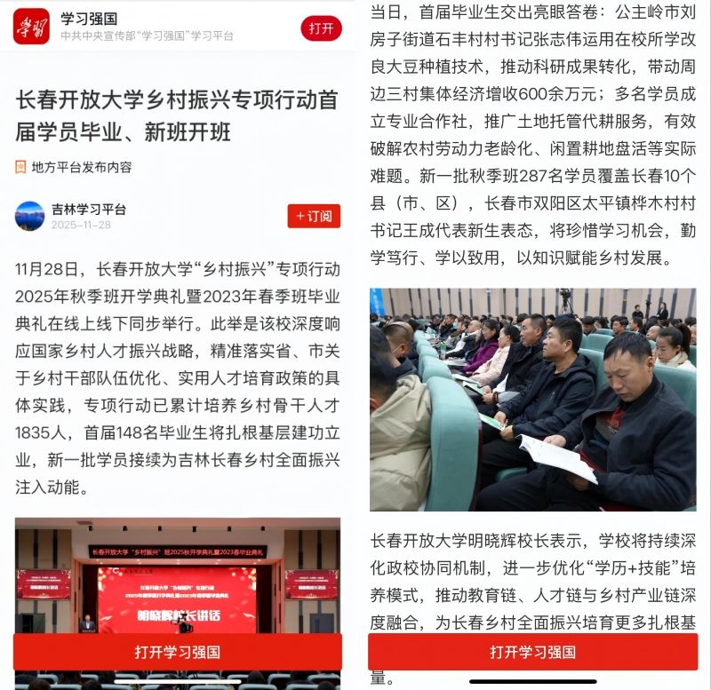 2025年11月28日,“学习强国”学习平台以《乡村振兴专项行动首届学员毕业、新班开班》为题,报道了学校精准对接农村发展需求,培养乡村本土人才的实践成果,首届毕业学员已成为基层治理、产业发展的骨干力量。