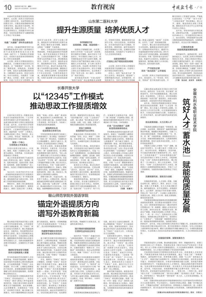 2025年11月17日,《中国教育报》专门报道了学校创新推行的“12345”思政工作模式,通过构建一体化育人制度体系、挖掘多元育人资源、拓展特色育人途径等举措,实现思政教育与教学管理、服务保障全过程深度融合,推动思政工作提质增效。