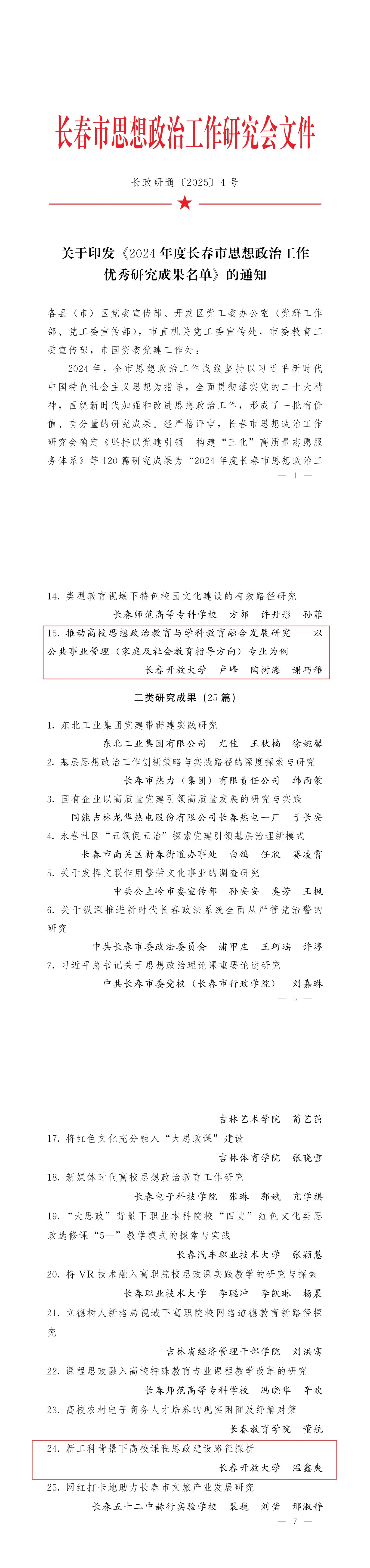 ▲ 2024年度长春市思想政治工作优秀研究成果评选结果公示