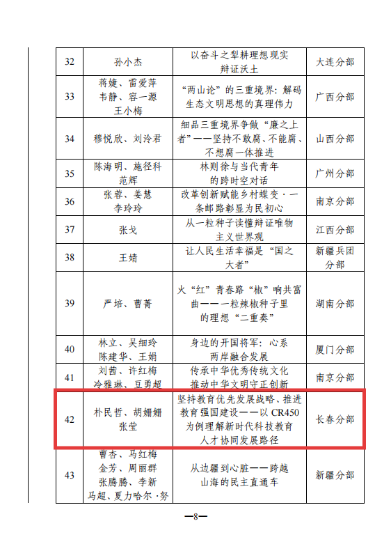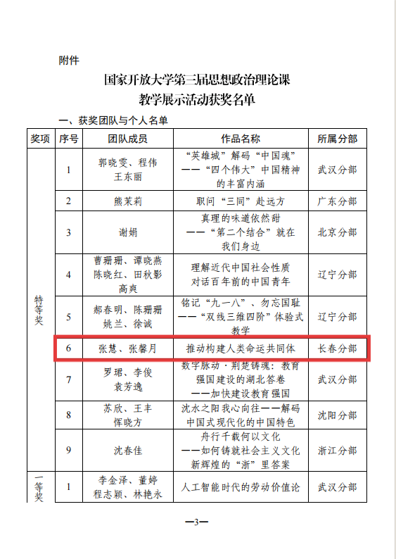 年初,国家开放大学组织举办了第三届思想政治理论课教学展示活动。经各分部推荐、总部组织专家严格评审,最终评选出评选出特等奖9个、一等奖21个、二等奖49个。其中,我校教师张慧、张馨月报送的《推动构建人类命运共同体》荣获特等奖;朴民哲、胡姗姗、张莹报送的《坚持教育优先发展战略、推进教育强国建设——以CR450为例理解新时代科技教育人才协同发展路径》荣获二等奖。
