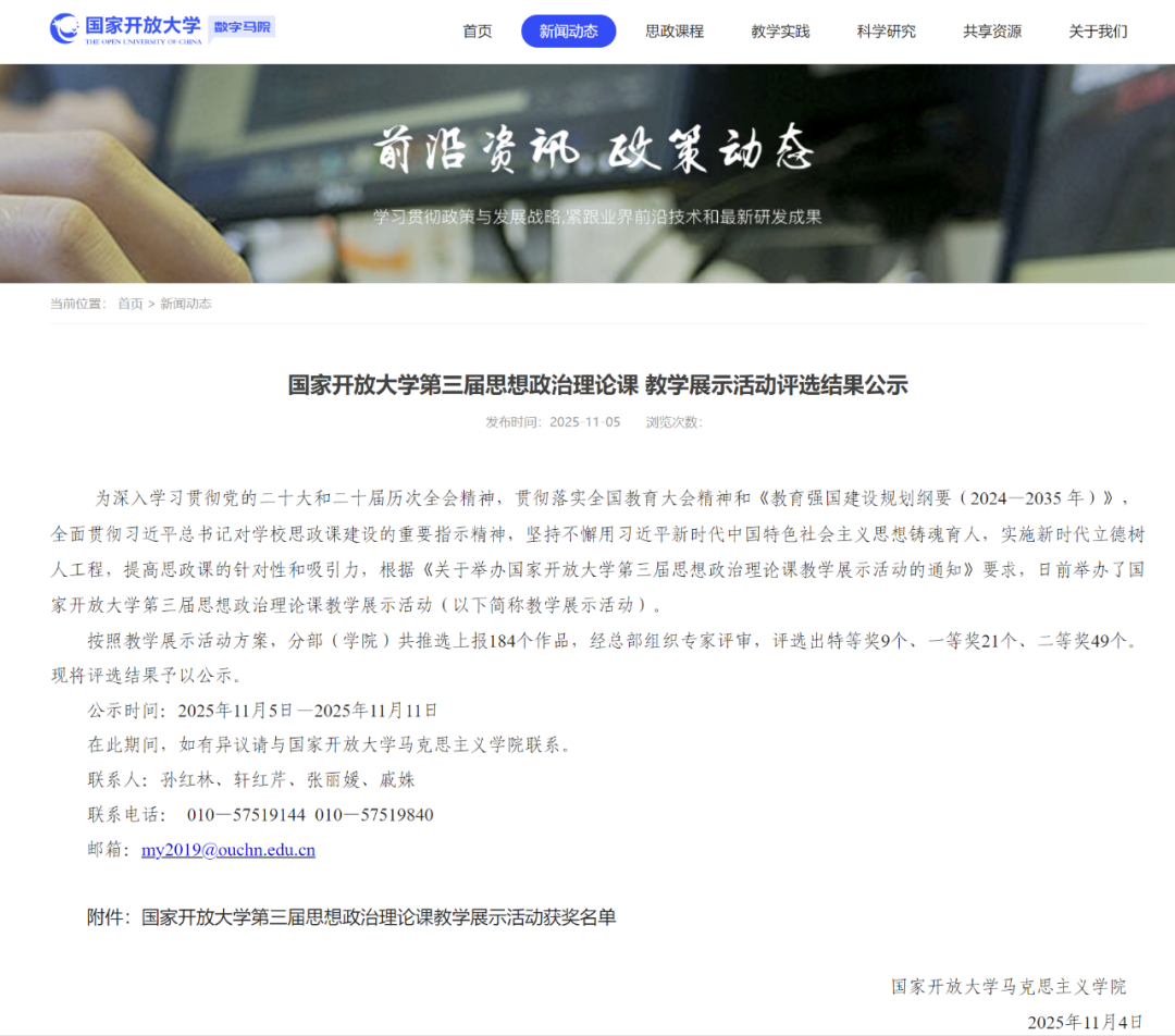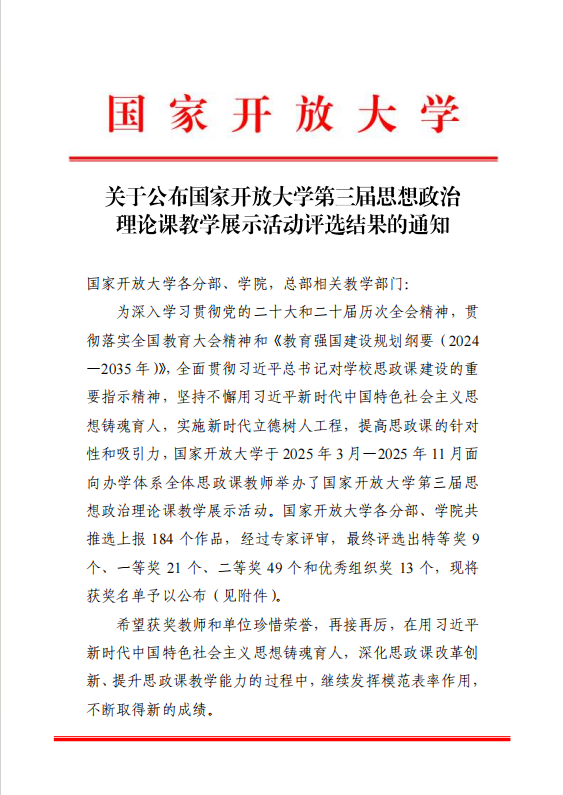 ▲ 国家开放大学第三届思政课教学展示活动评选结果公示截图