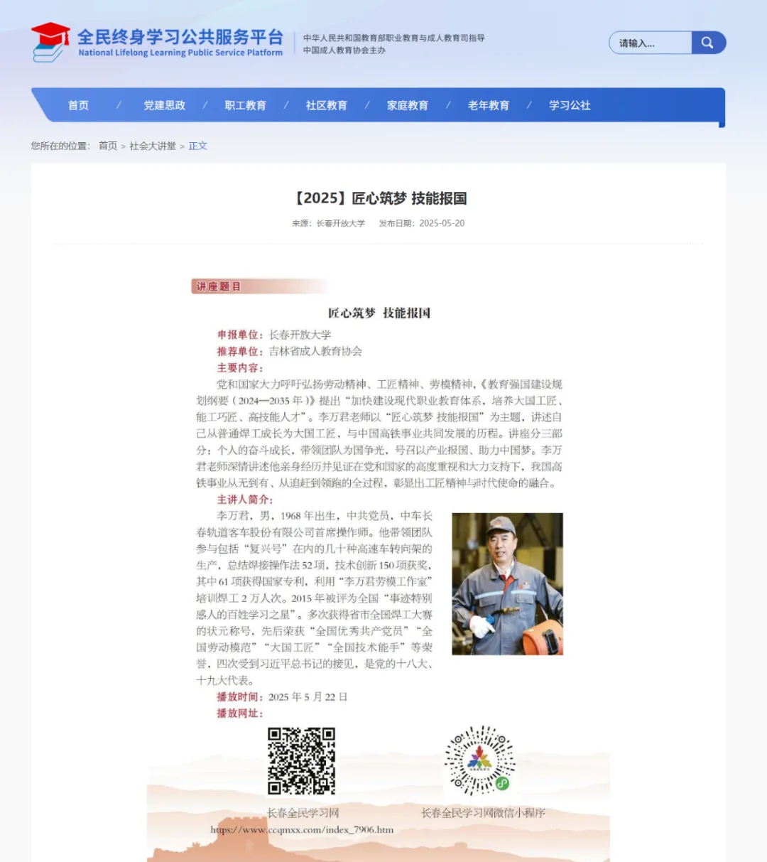 长春开放大学申报的《匠心筑梦 技能报国》讲座,特邀中车长春轨道客车股份有限公司首席技师、大国工匠李万君教授主讲。作为被誉为“工人院士”“高铁焊接大师”的行业泰斗,李万君教授从普通焊工成长为我国高铁焊接专家,四十年来凭借不服输的钻劲儿与韧劲儿,完成100余项技术攻关,斩获21项国家专利,通过“李万君劳模工作室”培训焊工2万人次。他先后荣获“全国优秀共产党员”“全国劳动模范”“大国工匠”等多项殊荣,四次受到习近平总书记接见,是党的十八大、十九大代表,2015年还被评为全国“事迹特别感人的百姓学习之星”。