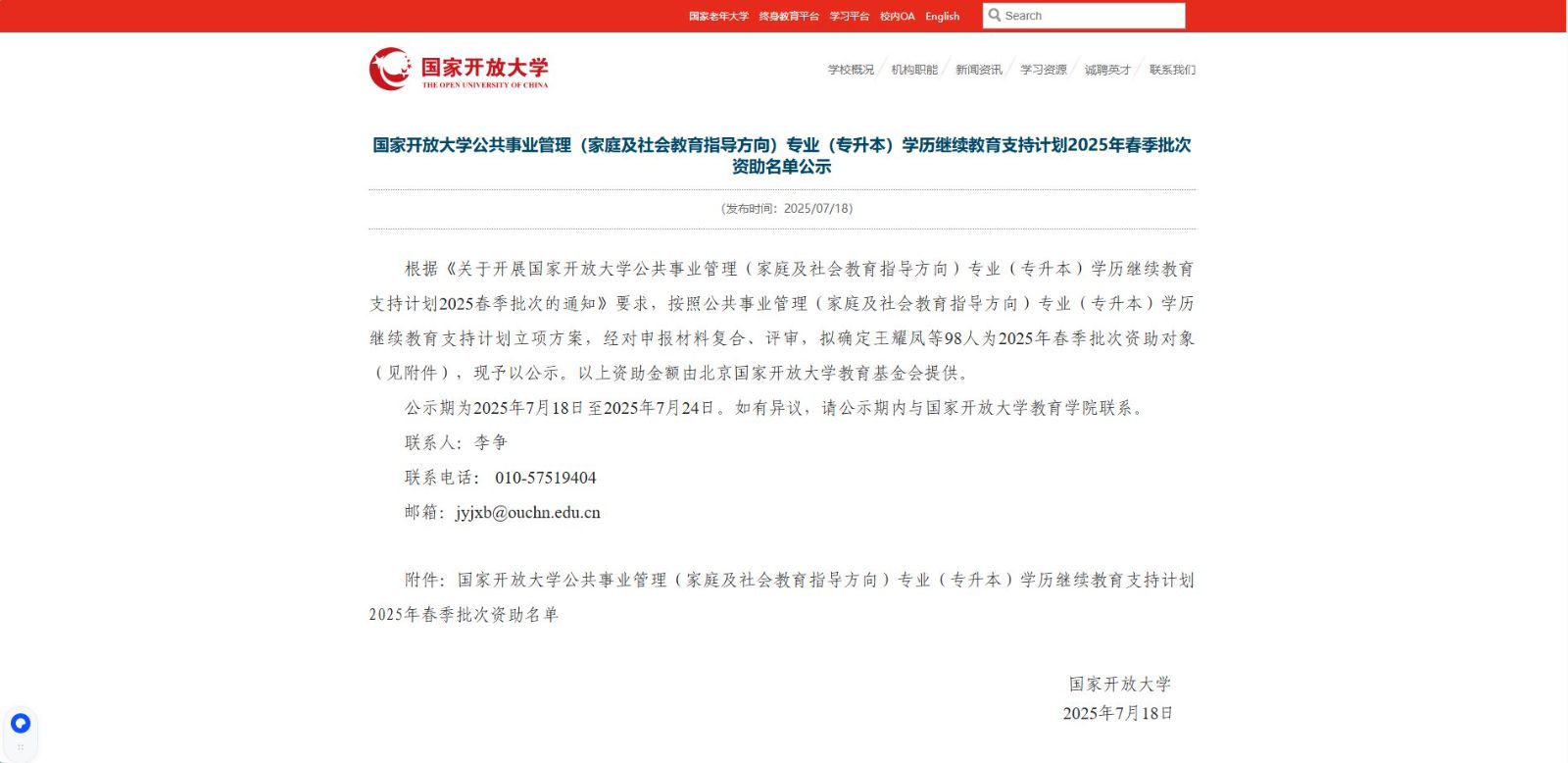 国家开放大学公共事业管理专业学历继续教育支持计划2025年春季批次资助名单公示.docx
