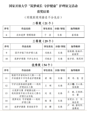 为深入学习贯彻党的二十大、二十届三中全会和全国教育大会精神,贯彻落实新时代立德树人工程,展现护理学专业学生职业风采和成长历程,增强学生的认同感和归属感,发掘一批优秀学习典型,让广大学生学有榜样、赶有目标,激发学生的学习热情,以实际行动助力“健康中国”建设,国家开放大学开展了“筑梦成长 守护健康”护理征文活动。