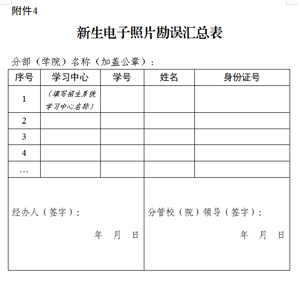 ①分部、学院核验新生身份无误,确系本人报名,但二次补采电子照片无法通过核验的,需根据复查结果填写《新生电子照片与身份证照片核验表》(附件3)、《新生电子照片勘误汇总表》(附件4),并按照《新生电子照片勘误材料要求》(附件5)相关规定将正确的电子照片及其他证明材料“一人一档”整理勘误后一并报送总部。总部留存材料,具体勘误工作方案另行安排。