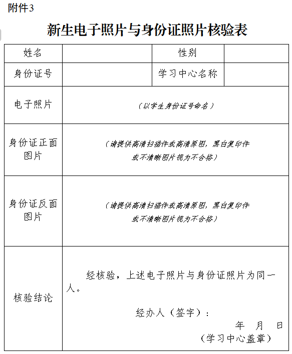 4.各级办学单位要高度重视此项工作,把好入口关,确保新生身份准确,杜绝冒名顶替行为,避免产生遗留问题。各学习中心要认真核验,承担审核的主体责任,采取各种手段确认学生身份,永久留存核验的档案信息。
